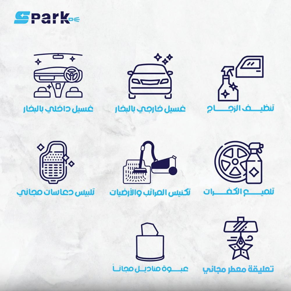 غسيل سيارات الرياض متنقل من باقة سبارك بلاتينيوم تتضمن خدمة غسيل شاملة باستخدام البخار تنظيف كامل للداخل والخارج مع التركيز على الزجاج والكفرات كما يتم تنظيف المراتب والأرضيات باستخدام مكنسة قوية.